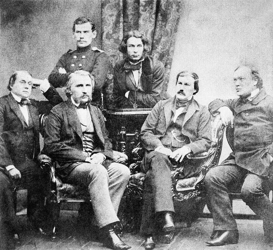 Групповой портрет русских писателей — членов редколлегии журнала «Современник». Гончаров Иван Александрович, Тургенев Иван Сергеевич, Лев Николаевич Толстой, Григорович Дмитрий Васильевич, Дружинин Александр Васильевич и Островский Александр Николаевич. Фото С. Л. Левицкого, 15 февраля 1856 года