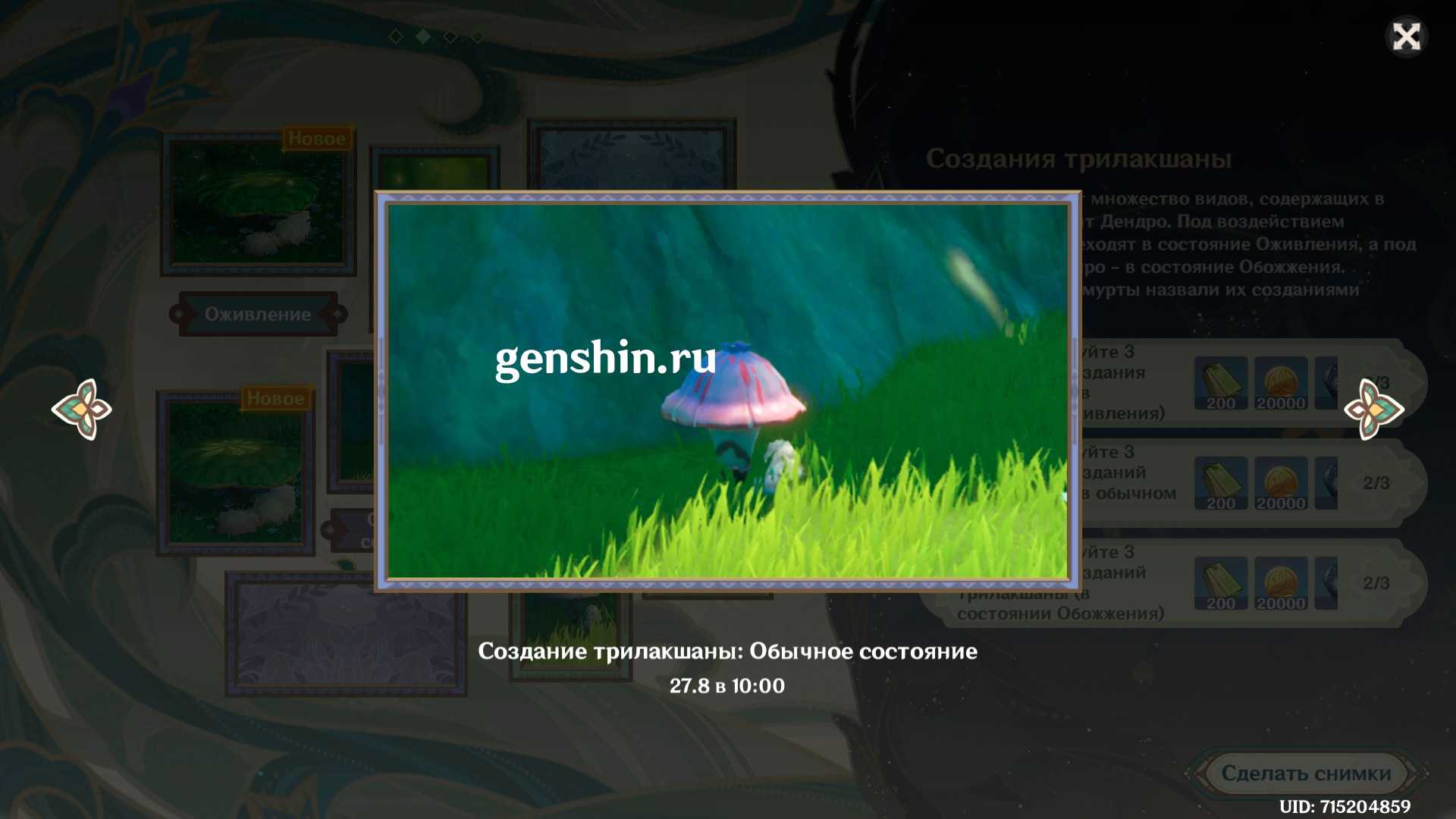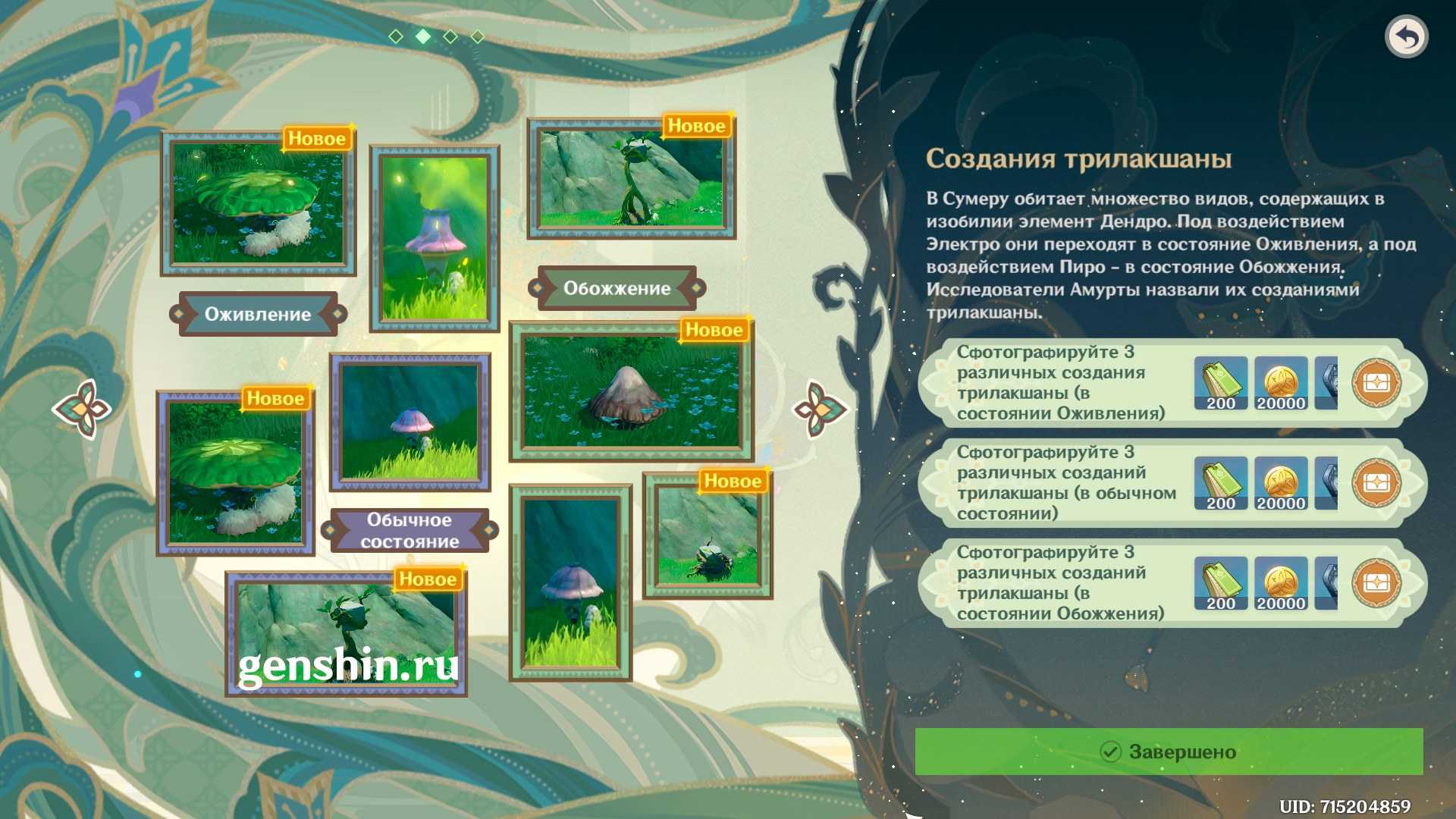 Создания трилакшаны в Genhin Impact — это второй этап задания, где нам предстоит сфотографировать растения Сумеру в самых разных состояниях: Оживление, обычное состояние и Обожжение.