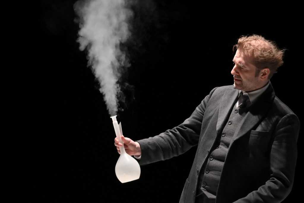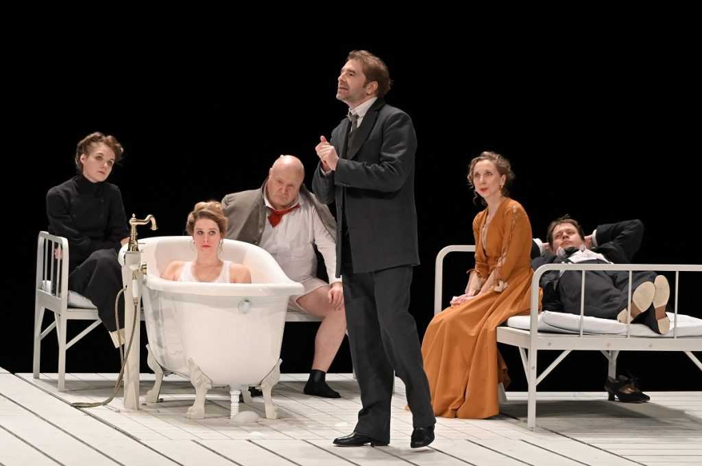 Занавес поднимается и перед зрителями появляются люди по левую сторону сцены. Складывается ощущение, что они, как будто, на больничных кроватях. Справа выходит химик Павел Протасов (Иван Волков). С первых секунд видно — герои по разные стороны сцены и жизни.