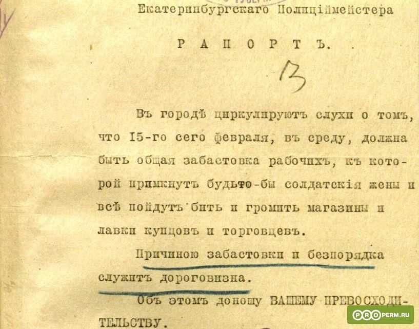 Рапорт Екатеринбургского полицмейстера пермскому губернатору о готовящейся забастовке рабочих в связи с дороговизной.