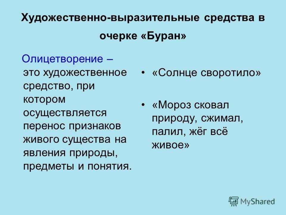 Художественно-выразительные средства в очерке «Буран» Олицетворение – это художественное средство, при котором осуществляется перенос признаков живого существа на явления природы, предметы и понятия. «Солнце своротило» «Мороз сковал природу, сжимал, палил, жёг всё живое»