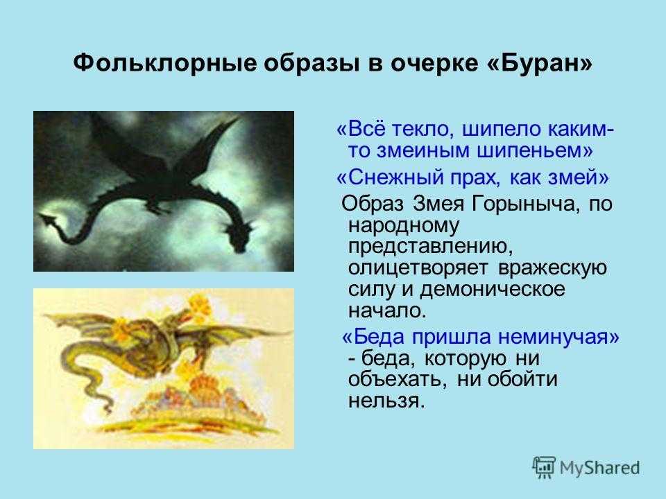 Фольклорные образы в очерке «Буран» «Всё текло, шипело каким- то змеиным шипеньем» «Снежный прах, как змей» Образ Змея Горыныча, по народному представлению, олицетворяет вражескую силу и демоническое начало. «Беда пришла неминучая» — беда, которую ни объехать, ни обойти нельзя.
