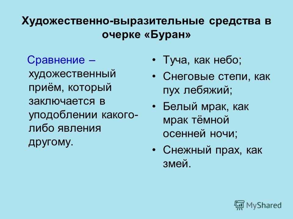 Художественно-выразительные средства в очерке «Буран» Сравнение – художественный приём, который заключается в уподоблении какого- либо явления другому. Туча, как небо; Снеговые степи, как пух лебяжий; Белый мрак, как мрак тёмной осенней ночи; Снежный прах, как змей.
