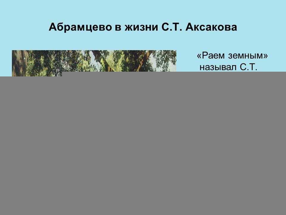 Абрамцево в жизни С.Т. Аксакова «Раем земным» называл С.Т. Аксаков своё любимое Абрамцево, которое купил в 1843 году.