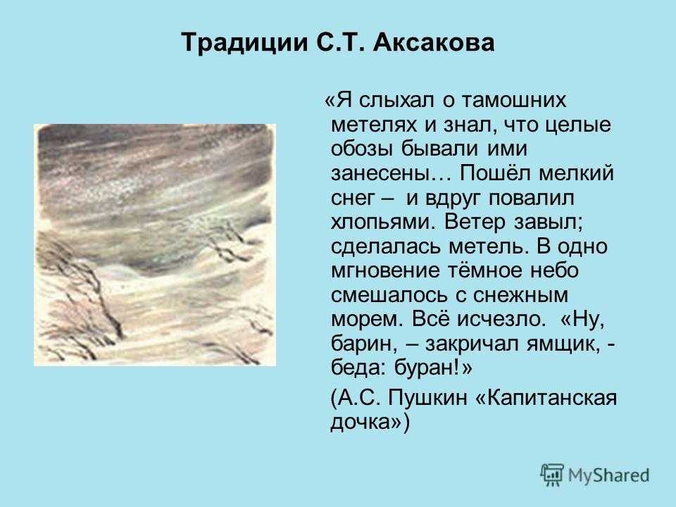 Традиции С.Т. Аксакова «Я слыхал о тамошних метелях и знал, что целые обозы бывали ими занесены… Пошёл мелкий снег – и вдруг повалил хлопьями. Ветер завыл; сделалась метель. В одно мгновение тёмное небо смешалось с снежным морем. Всё исчезло. «Ну, барин, – закричал ямщик, — беда: буран!» (А.С. Пушкин «Капитанская дочка»)