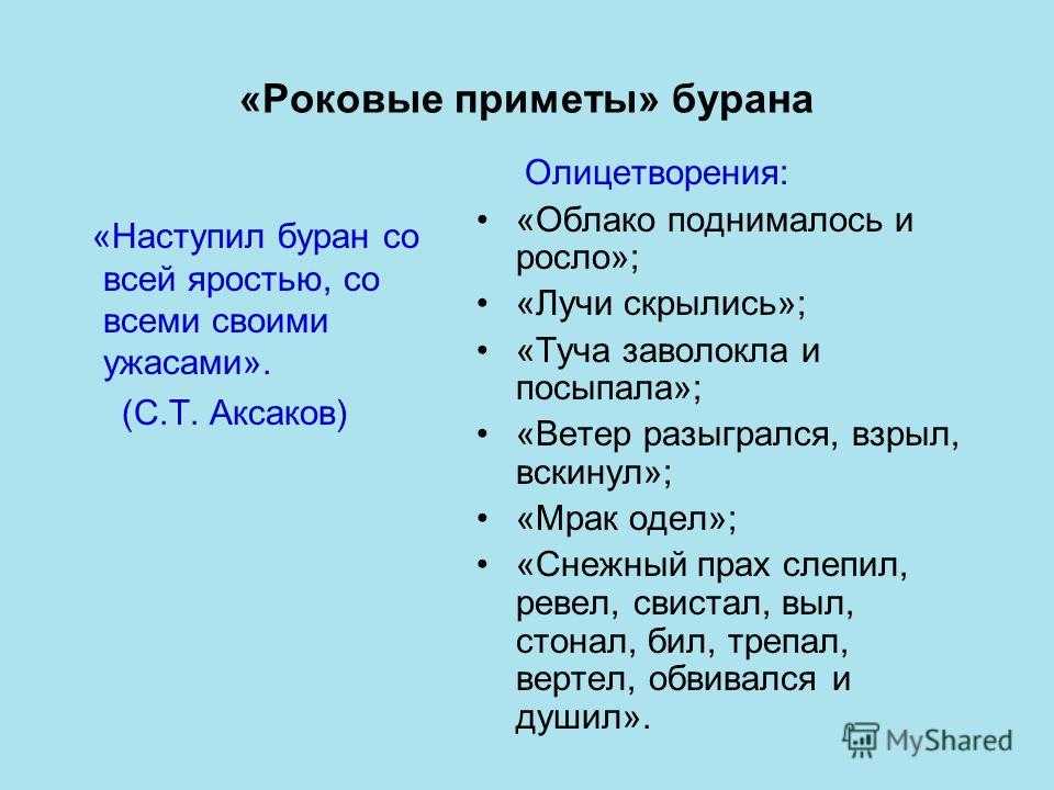 «Роковые приметы» бурана «Наступил буран со всей яростью, со всеми своими ужасами». (С.Т. Аксаков) Олицетворения: «Облако поднималось и росло»; «Лучи скрылись»; «Туча заволокла и посыпала»; «Ветер разыгрался, взрыл, вскинул»; «Мрак одел»; «Снежный прах слепил, ревел, свистал, выл, стонал, бил, трепал, вертел, обвивался и душил».