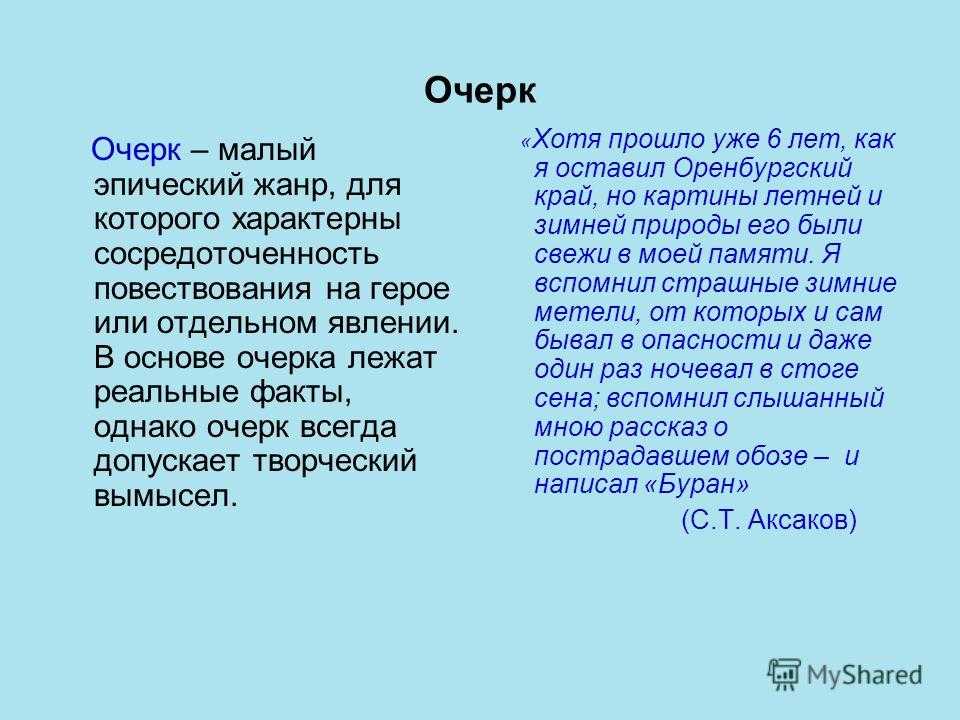 Очерк Очерк – малый эпический жанр, для которого характерны сосредоточенность повествования на герое или отдельном явлении. В основе очерка лежат реальные факты, однако очерк всегда допускает творческий вымысел. « Хотя прошло уже 6 лет, как я оставил Оренбургский край, но картины летней и зимней природы его были свежи в моей памяти. Я вспомнил страшные зимние метели, от которых и сам бывал в опасности и даже один раз ночевал в стоге сена; вспомнил слышанный мною рассказ о пострадавшем обозе – и написал «Буран» (С.Т. Аксаков)