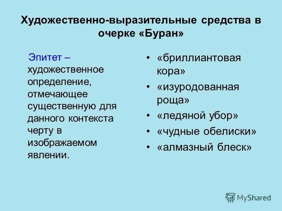 Художественно-выразительные средства в очерке «Буран» Эпитет – художественное определение, отмечающее существенную для данного контекста черту в изображаемом явлении. «бриллиантовая кора» «изуродованная роща» «ледяной убор» «чудные обелиски» «алмазный блеск»