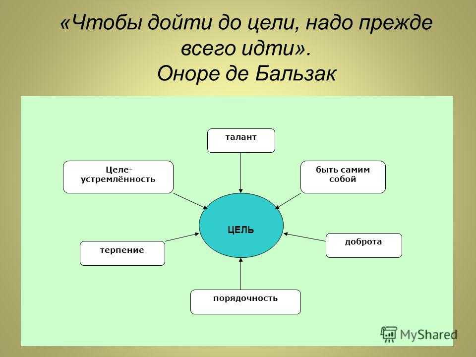 «Чтобы дойти до цели, надо прежде всего идти». Оноре де Бальзак ЦЕЛЬ талант быть самим собой Целе- устремлённость доброта терпение порядочность ЦЕЛЬ талант быть самим собой Целе- устремлённость доброта терпение порядочность