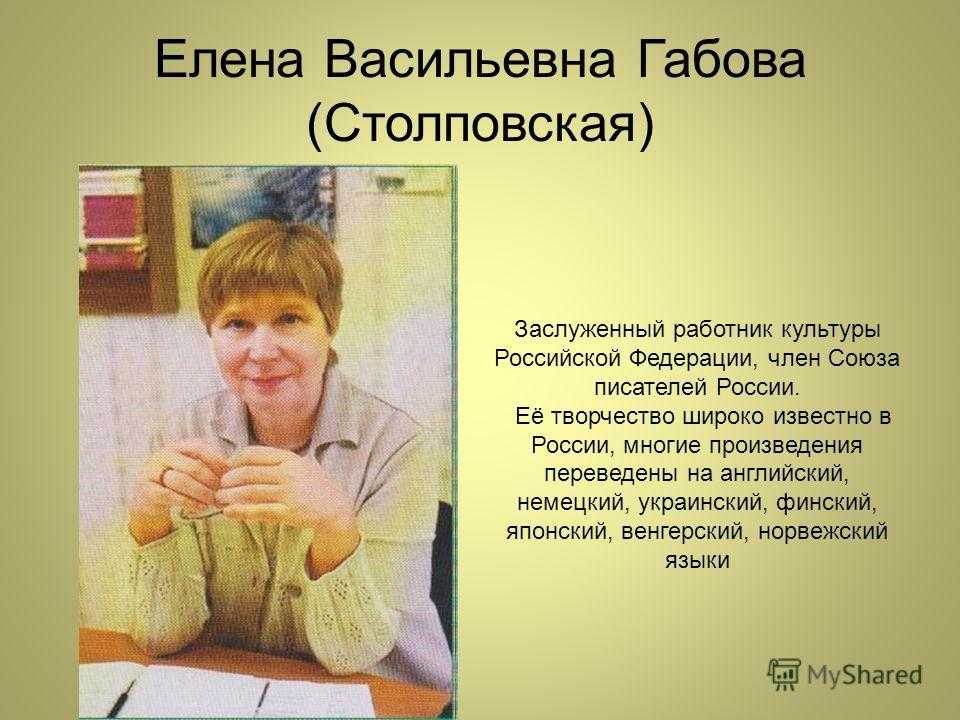 Елена Васильевна Габова (Столповская) Заслуженный работник культуры Российской Федерации, член Союза писателей России. Её творчество широко известно в России, многие произведения переведены на английский, немецкий, украинский, финский, японский, венгерский, норвежский языки