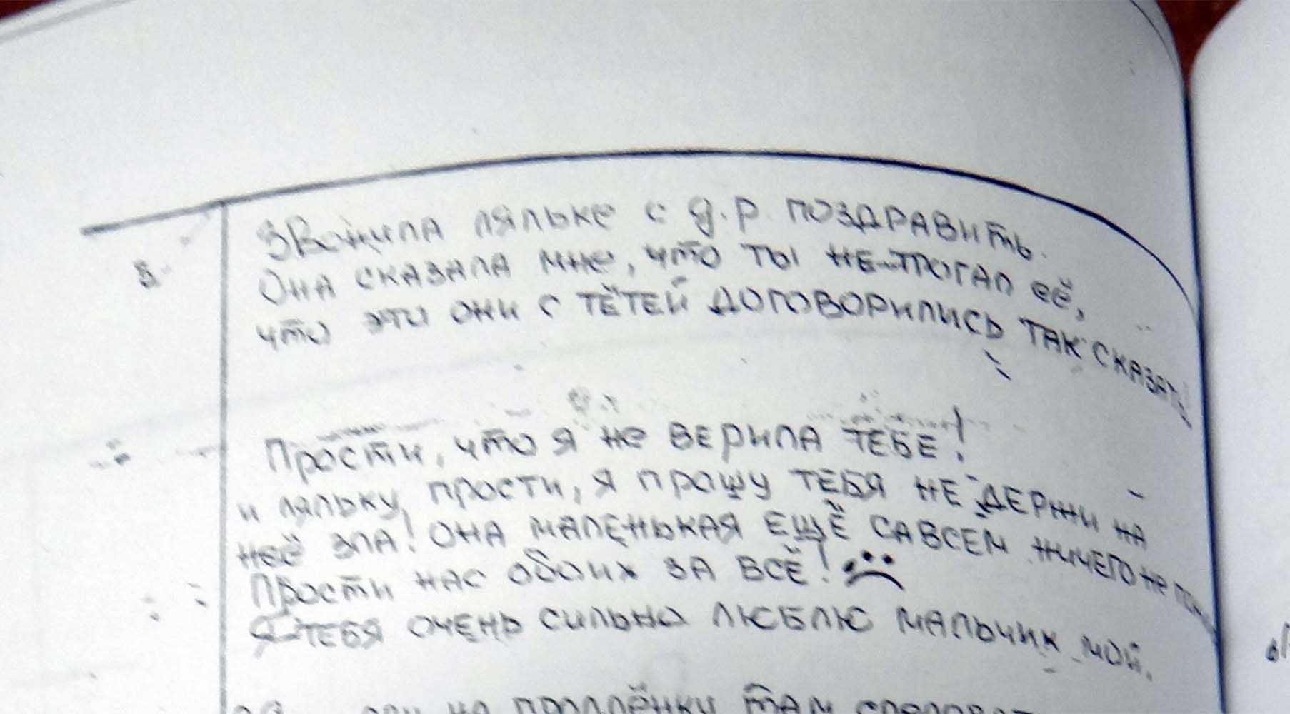«Звонила ляльке с д. р. поздравить. Она сказала мне, что ты не трогал её… Прости, что я не верила тебе! Родной, прости!»