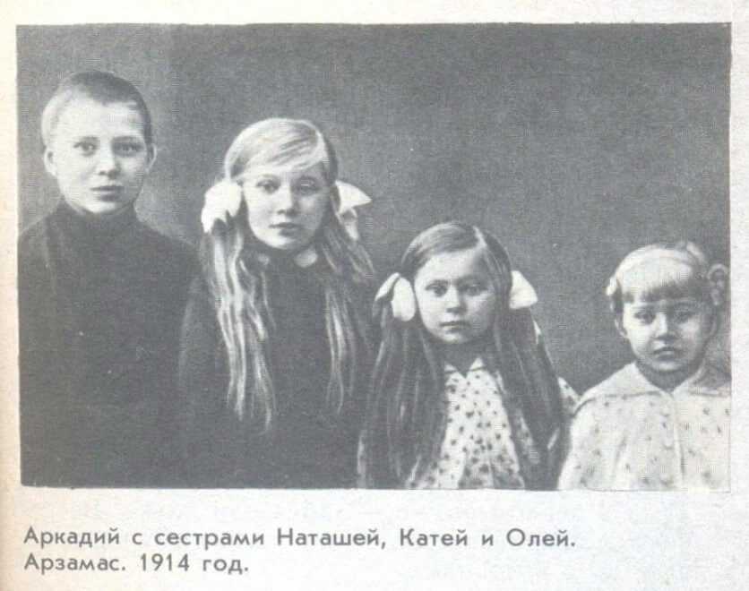 В 1912-м семья переехала в Арзамас, с которым у Аркадия связаны самые теплые воспоминания. Совсем еще ребенок, старший в семье, стал помогать матери воспитывать своих сестер. В 1914-м отца призвали на фронт Первой мировой, а мать работала сутки напролет в госпитале. Мальчик очень тосковал по отцу, поэтому при первой возможности сбежал на фронт, но его быстро вернули домой.