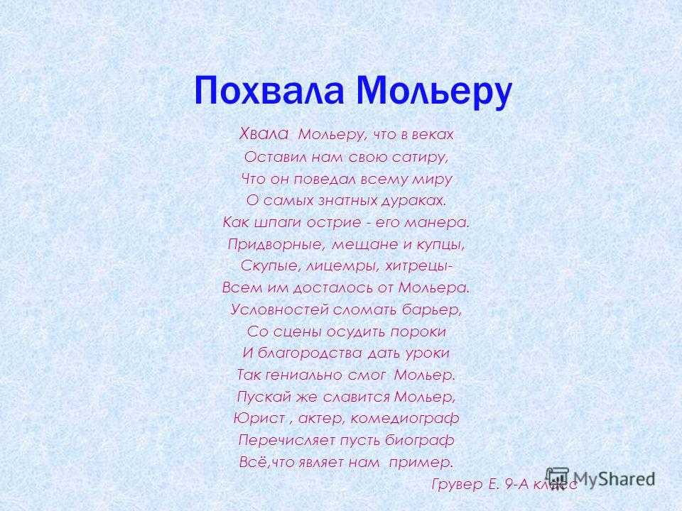 Похвала Мольеру Хвала Мольеру, что в веках Оставил нам свою сатиру, Что он поведал всему миру О самых знатных дураках. Как шпаги острие — его манера. Придворные, мещане и купцы, Скупые, лицемры, хитрецы- Всем им досталось от Мольера. Условностей сломать барьер, Со сцены осудить пороки И благородства дать уроки Так гениально смог Мольер. Пускай же славится Мольер, Юрист, актер, комедиограф Перечисляет пусть биограф Всё,что являет нам пример. Грувер Е. 9-А класс
