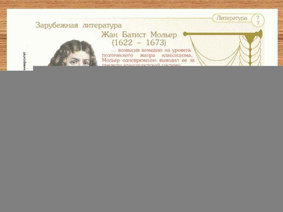 Биография Настоящее имя Мольера — Жан Батист Поклен( )Он родился в Париже и был крещен 15 января 1622 года, как указывает запись в книге парижской церкви Святого Евстахия. Его отец Жан Поклен и оба деда были обойщиками. Судя по тому, что отец писателя купил себе должность королевского обойщика и камердинера короля, дела его шли прекрасно. Мать, Мари Крессе, умерла совсем молодой. Жан Поклен видел в первенце Жане Батисте преемника своей придворной должности и даже добился того, чтобы король закрепил за ним место официально. Поскольку это дело не требовало особой образованности, Жан Батист к четырнадцати годам едва научился читать и писать. Однако дед настоял на том, что мальчика отдали в Клермонский иезуитский колледж. В то время это было лучшее учебное заведение в Париже. Учебная программа включала древние языки, естественные науки, философию, латинскую словесность. Этих знаний Жану Батисту хватило, чтобы читать в подлиннике Плавта, Теренция, других авторов, сделать стихотворный перевод поэмы Лукреция «О природе вещей». Он получил диплом лиценциата права и даже выступал несколько раз в суде как адвокат. Однако ни адвокатом, ни придворным обойщиком он не стал. Отказавшись от прав на отцовскую должность и взяв свою долю из материнского наследства, он отдался страсти, которая полностью его подчинила — театру, мечтая стать трагическим актером.