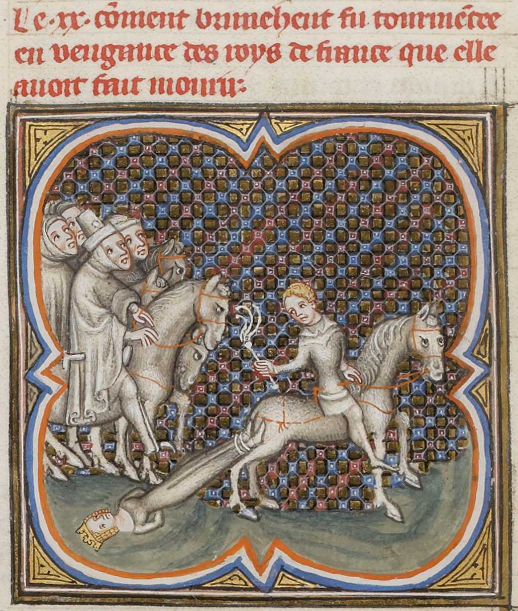 Бывшая королева предстала пред судом Хлотаря, сына своей заклятой противницы Фредегонды. Тот обвинил собственную тётку в смерти десяти франкских королей, включив в это число жертв своей матери. После трёхдневных жестоких пыток, то, что осталось от бывшей красавицы усадили на верблюда и провезли по городу на потеху его жителям и солдатам. Затем Брунгильду за волосы, руку и ногу привязали к хвосту дикого коня, который, пустившись вскачь, задними копытами разбил тело королевы. По другой версии, Брунгильду разорвали несколькими лошадьми. Долгая жизнь прекрасной королевы Австразии закончилась. Спустя шесть веков, по мнению некоторых учёных, кровавая правительница стала прототипом Брюнхильды, героини германского эпоса «Песнь о Нибелунгах».